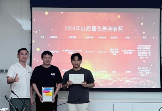 会议也展示了各个项目取得的改善成果,在今年开局不利的情况下,各位项目负责人,敢于挑重担,迅速突破并达成目标,感谢这些同事其团队的努力。希望大家后续再接再厉,影响并引领其它同事更多的参与到质量改善工作中来。会议最后,由公司领导黄总、马总为改善项目负责人颁发了重量级奖品,并表达了祝贺。